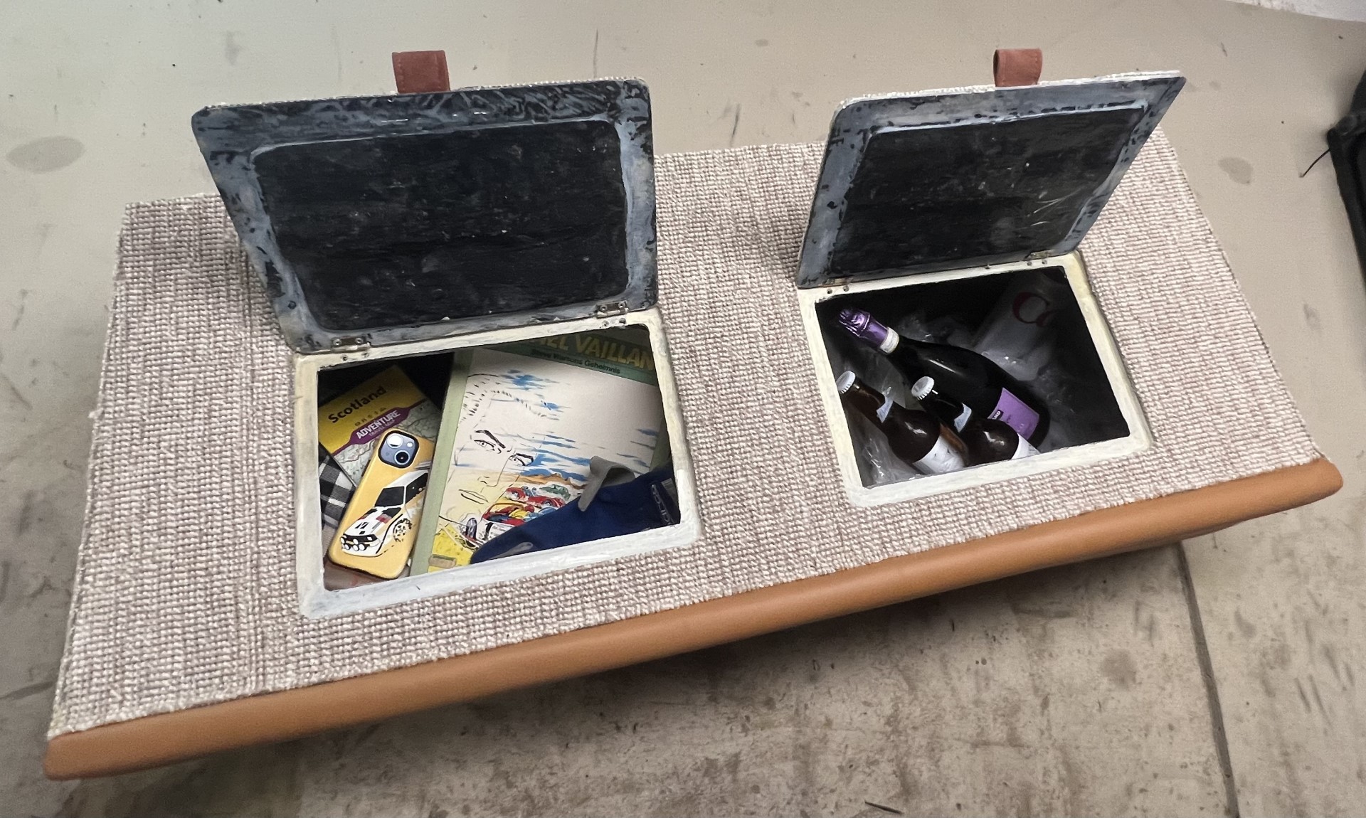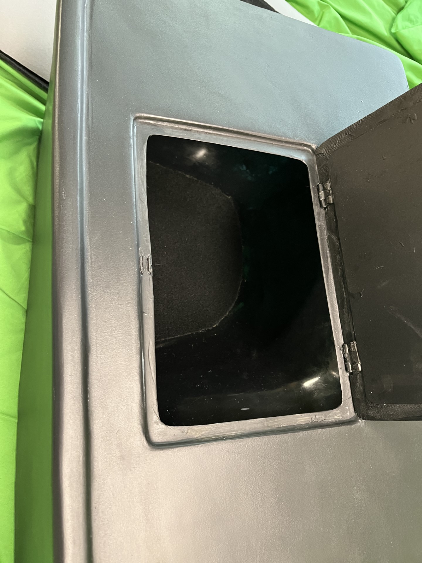 Porsche had openings from the front and open to the seat molding. Now you have a fully closed box- ready for your cag of ice, or bigger speaker set up, easy access from the top even while you drive has a passenger access to the box.
